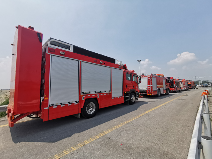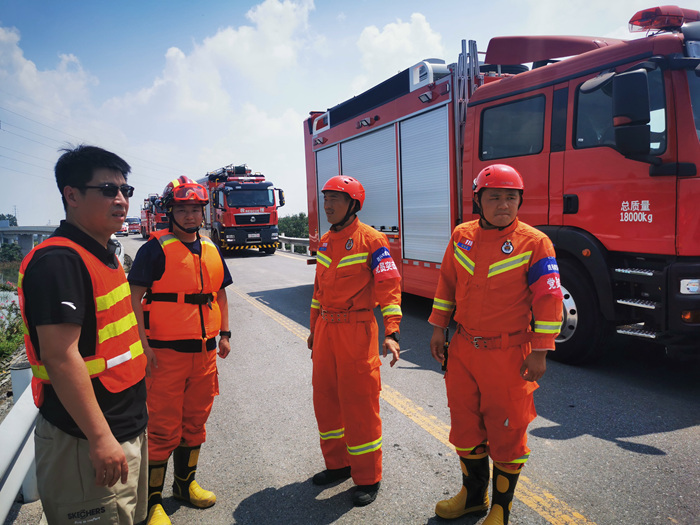 高遠圣工應急救援消防車,配合江蘇消防支隊的遠程供水車在荷寶高速鳳泉口、新中大道前辛莊路口進行清障、警戒、抽水任務(wù)。