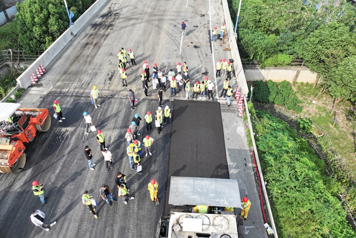 作為本次活動(dòng)的核心環(huán)節(jié),全體人員實(shí)地觀摩了由高遠(yuǎn)路業(yè)進(jìn)行施工的預(yù)防性養(yǎng)護(hù)技術(shù)現(xiàn)場(chǎng),直觀了解實(shí)際應(yīng)用效果。在長(zhǎng)纖維功能化復(fù)合封層技術(shù)區(qū)域,技術(shù)人員講解了該技術(shù)如何通過(guò)一層找平,兩層抗裂,三層防水為道路建立完善的表面功能。在MOH抗滑超薄磨耗層技術(shù)現(xiàn)場(chǎng),參觀人員對(duì)其抗水損、耐磨耗和抗滑性能進(jìn)行詳細(xì)了解。針對(duì)車(chē)轍、沉陷、龜裂等病害,改性鋪裝技術(shù)展示了如何將瀝青混凝土舊路面在常溫條件下改性成復(fù)合有機(jī)水硬性材料路面。以材料關(guān)鍵技術(shù)為根本,以成套專(zhuān)用裝備為依托,以當(dāng)代工程技術(shù)為手段,該工藝具有抗變形、防水損、耐老化、長(zhǎng)壽命等多重技術(shù)優(yōu)勢(shì)。